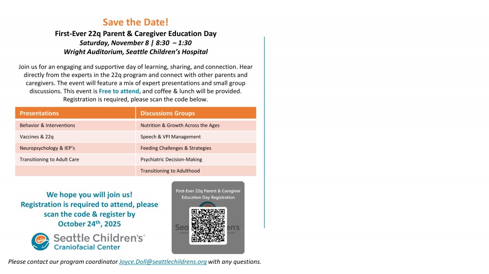 Calling all families in the Seattle and surrounding area to attend an upcoming education day organized for parents and caregivers in our 22q community.